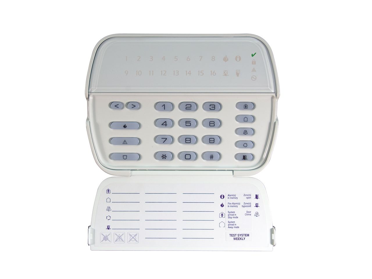 = KOD:105332 PKOD:5332 =LED klávesnice s krytem kláves, 1 zónový vstup/výstup, pro ovládání 8 bloků, zobrazuje prvních 16 zón, poruchu, paměť, odpojení, požár a program, 5 programovatelných tlačítek, 3 alarmy aktivované z klávesnice, podsvícení kláves, integrovaný bzučák, odběr 130mA