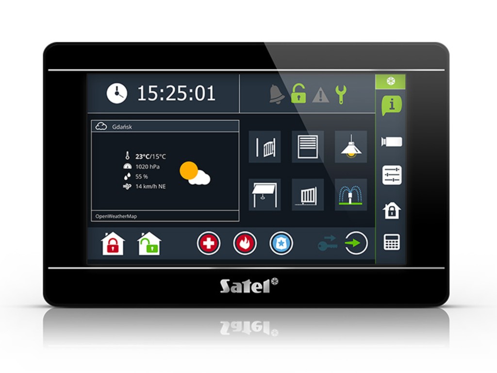 • „widgety“ umožňující uživateli obsluhu klávesnice, ovládání zabezpečovacího systému a řízení domácí automatizace