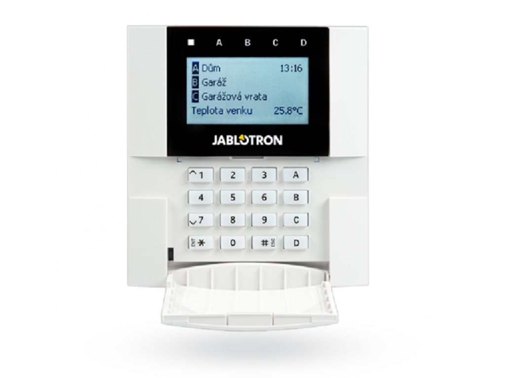 JA-110E je sběrnicová klávesnice s LCD displejem, klávesnicí a čtečkou RFID pro ovládání zabezpečovacího sytému. Obsahuje 4 funkční klávesy pro ovládání sekcí, PG výstupů a dalších funkcí. Funkční tlačítka slouží současně jako indikátory stavu.